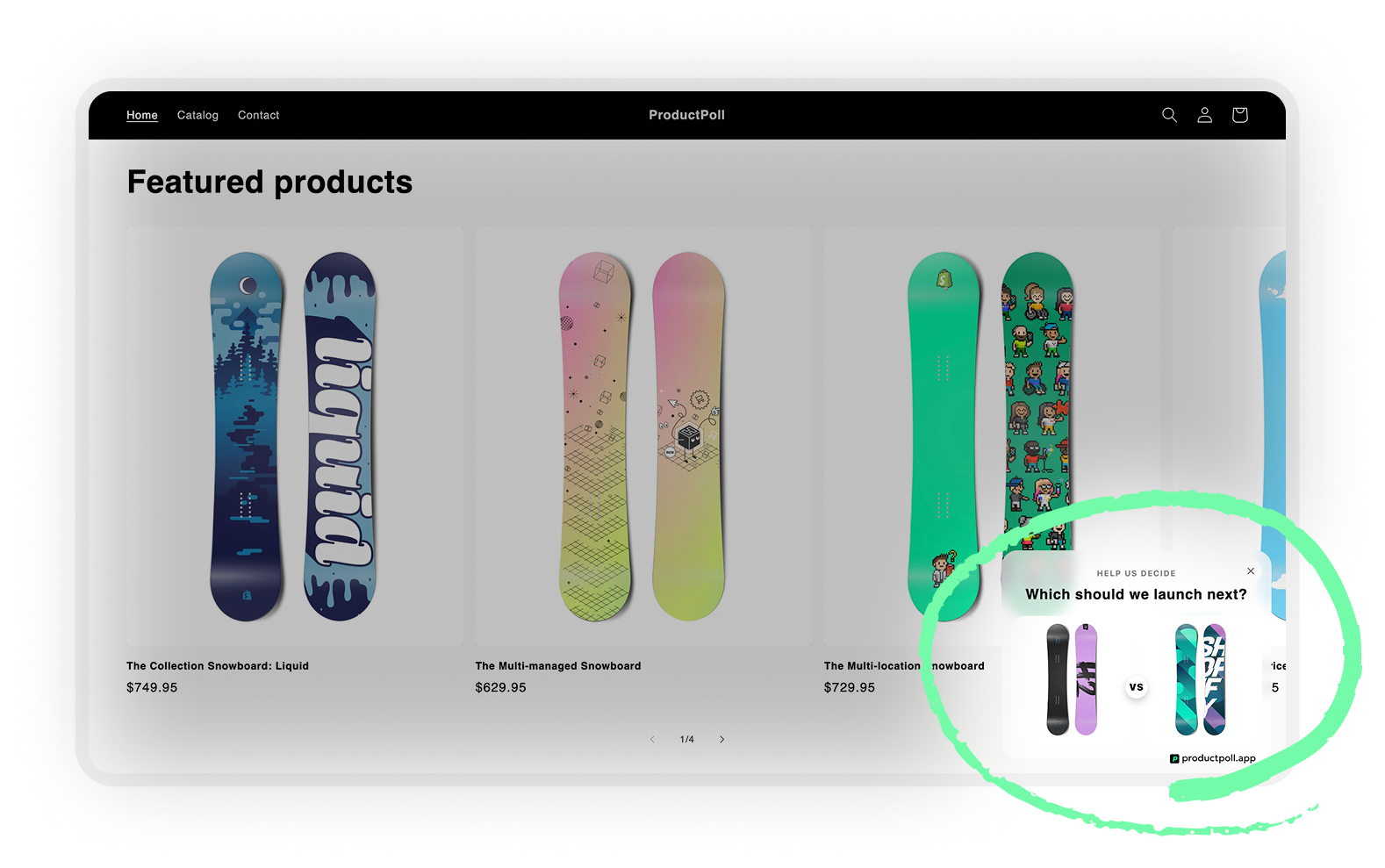 Run visual polls with product concept images. Customers vote between two designs, giving you clear preference data before you manufacture anything.